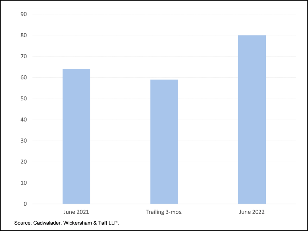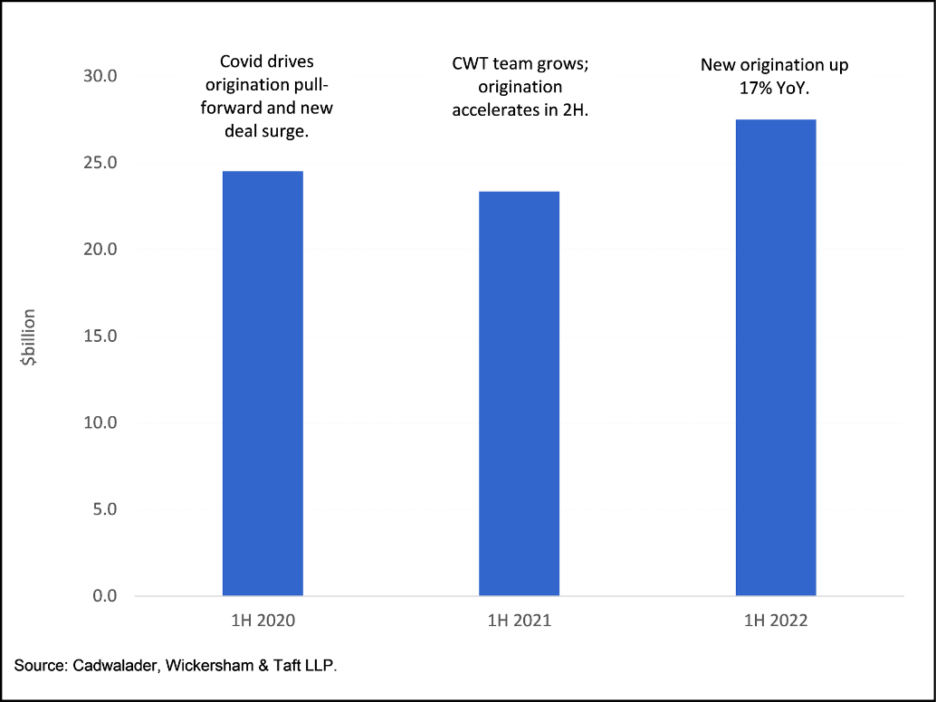 Cadwalader representations on new fund finance facilities in the U.S. rose 17% in the first half to total more than $27.0 billion. (The final tally may rise as we complete our dataset for June closings.) Growth in fund finance origination comes as overall credit markets have decelerated meaningfully. Corporate bond issuance declined by 26% in the first half and non-mortgage structured products issuance came in 70% below 1H 2021.