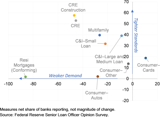 It certainly helped that, coming into the year, lending standards were still easing as the COVID brakes came off and demand for credit was still expanding across all major lending categories. That’s not the setup for 2023.