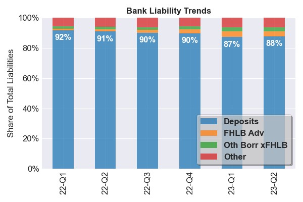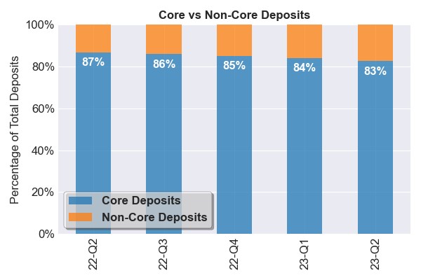 Deposit internals. Apparent deposit stability was partially manufactured as the share of brokered deposits rose at many institutions and core deposits declined.