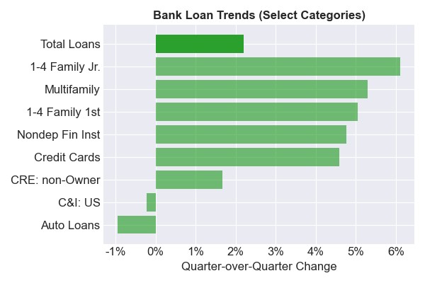 Loan Growth. Where is the loan growth coming from? Loans to non-depository financial institutions, where fund finance loans are often included, posted a 4.7% growth rate over the quarter – an impressive annualized clip. (Growth in junior single-family loans may be sign of financially stretched consumers.)