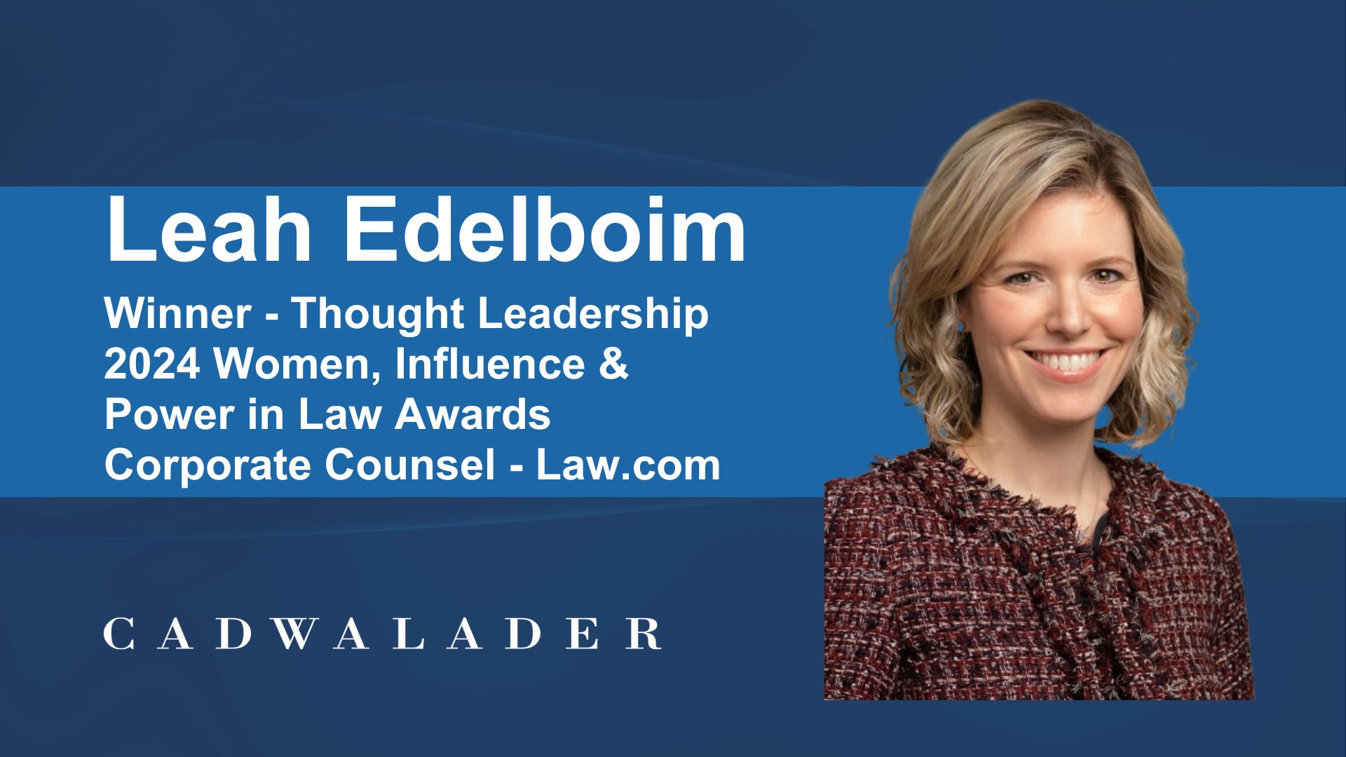 Cadwalader fund finance partner Leah Edelboim has been named a winner in the “Law Firm Thought Leadership” category of Corporate Counsel’s 2024 Women, Influence and Power in Law Awards.