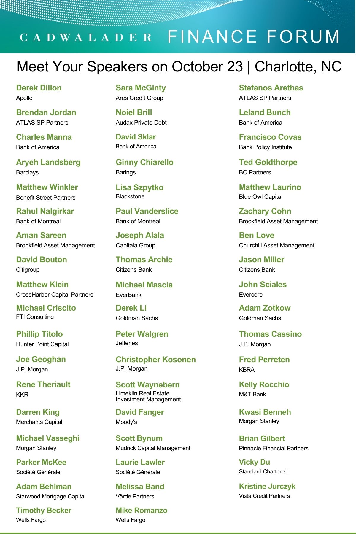 We are thrilled to once again provide you with direct access to thought leaders and top executives serving as featured faculty for the finance industry’s pre-eminent event on Wednesday, October 23 at the JW Marriott in Charlotte.
