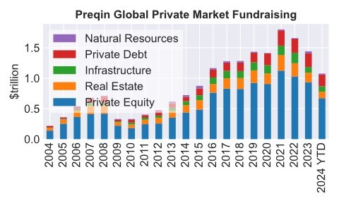 Fundraising across private funds will close lower in 2024 but the year-to-date total now exceeds $1.0 trillion, according to the latest data from Preqin. Closing the year above a trillion dollars in new commitments confirms the durable role of private fund allocations in institutional investment portfolios amid a challenging environment.