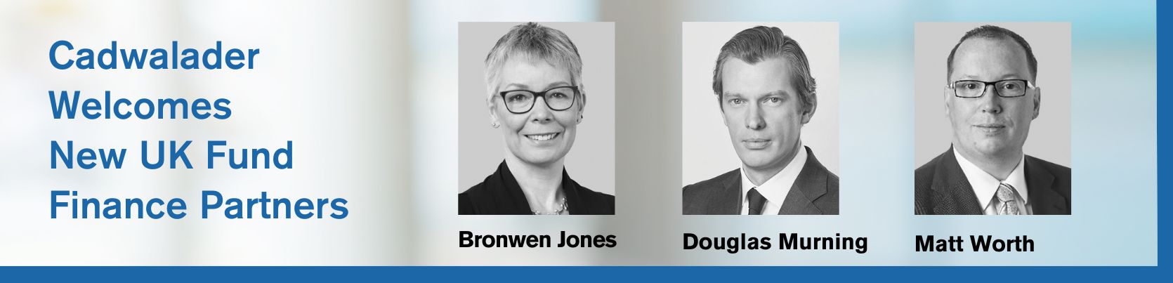Cadwalader is adding leading UK fund finance lawyers Bronwen Jones, Douglas Murning and Matthew Worth as partners in the firm’s London office.