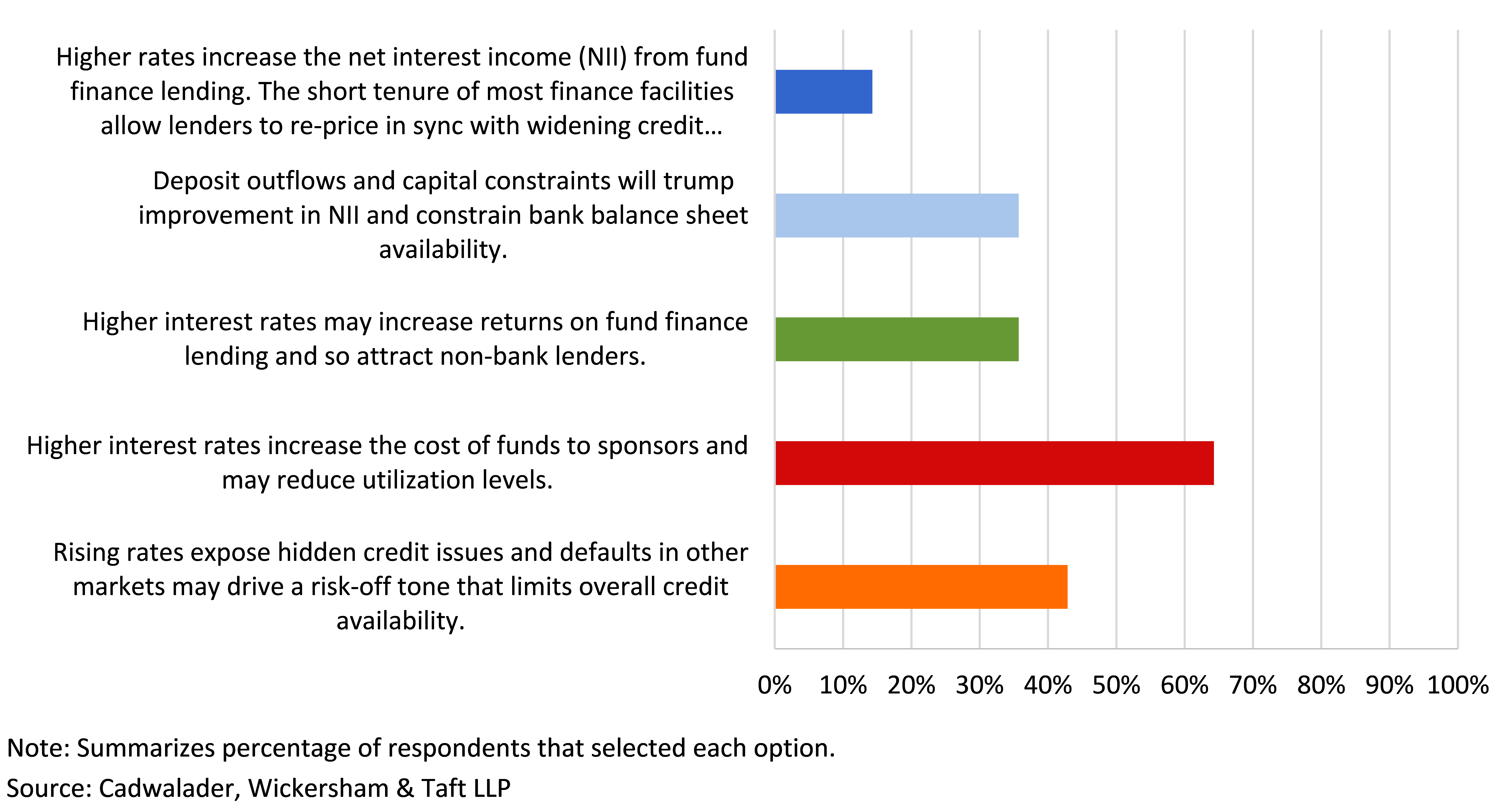 We all have seen incredible growth in the fund finance product over the last several years. With the rapid increase in interest rates in the United States and elsewhere, it’s prudent to ask what is the future of the fund finance product in a rising rate environment. To help gain some insight, Cadwalader sent out a client survey to our bank clients, “The Cadwalader Fund Finance Decision Maker Survey.” Here is what we have found.
