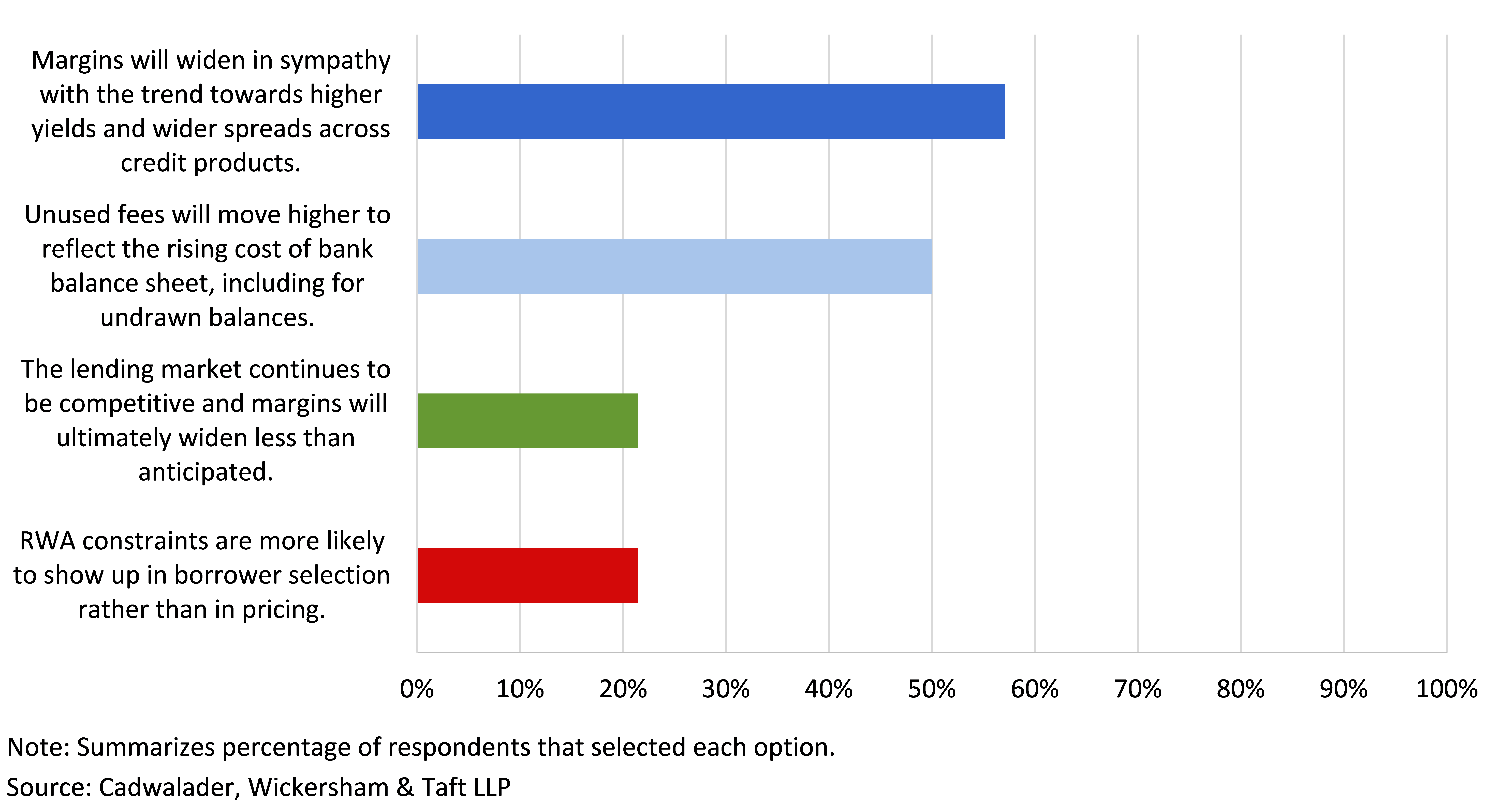 In such an environment, we would expect banks with RWA pressures to pursue three strategies. First, we expect to see an emphasis on core sponsor relationships. Second, banks are likely to pursue capital relief trades to help manage their RWA proactively (see our discussion of Cadwalader’s capabilities in this area here). Third, we expect a continued re-evaluation of all facets of deal economics, as is apparent from the survey responses.