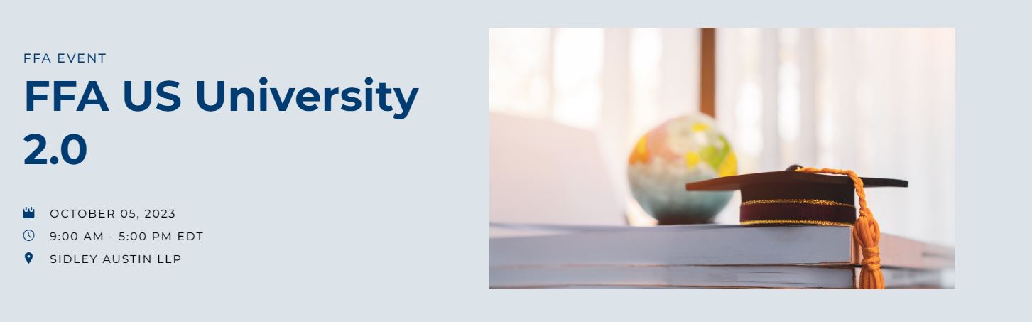 The FFA has announced the exciting agenda and stellar lineup of speakers for their upcomingFFA University 2.0 training program. Taking place in New York onOctober 5, 2023, this full-day, in-person training session is tailor-made for mid-level bankers and lawyers specializing in U.S. law.