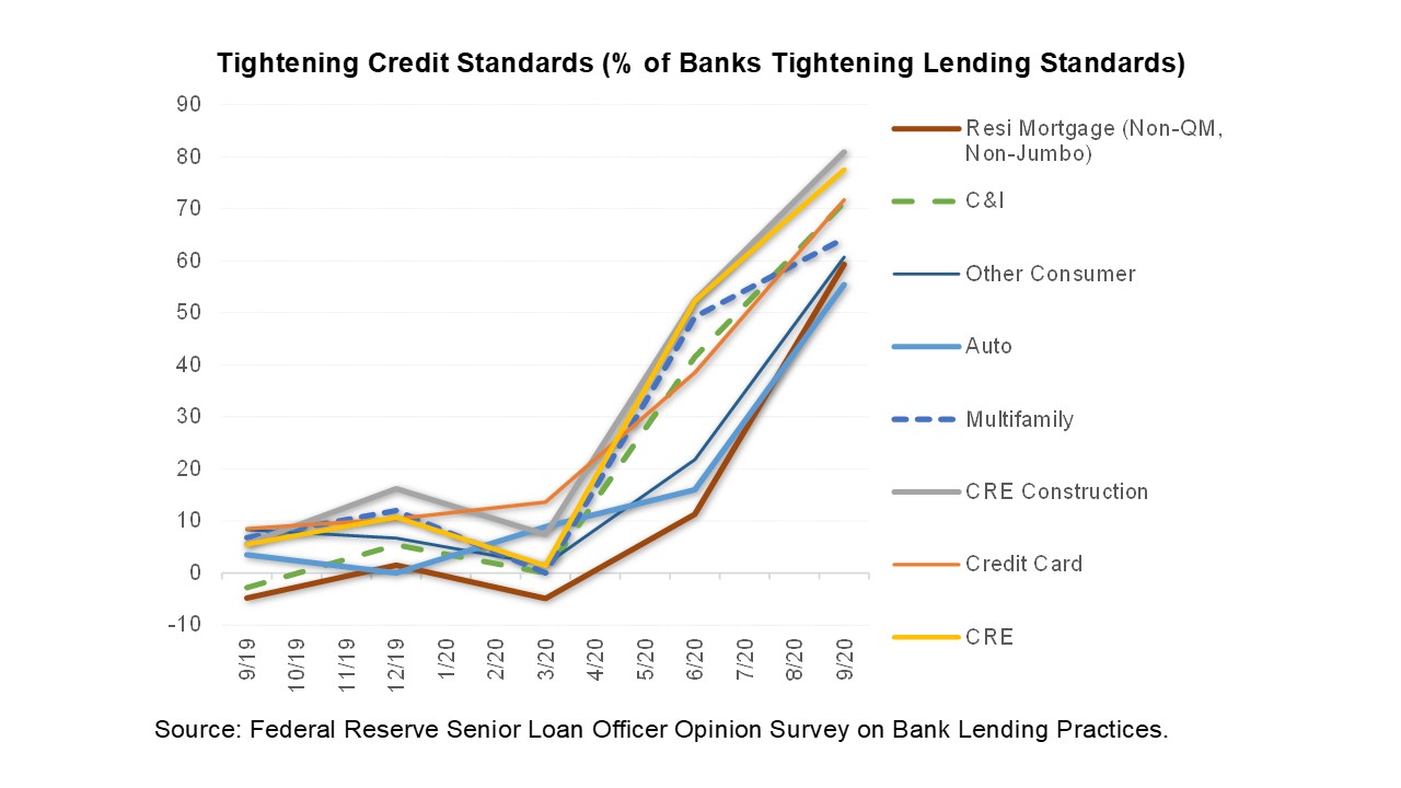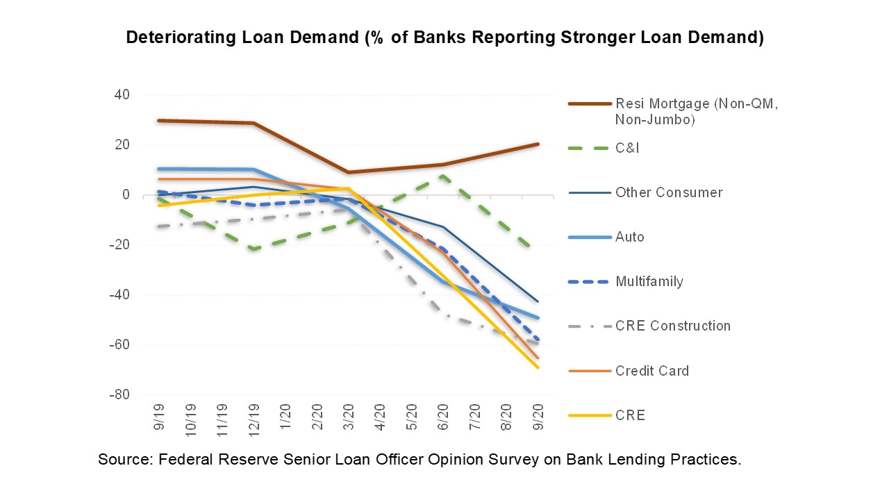 While banks are flush with deposits, loan origination is proving challenging, in part because loan demand has collapsed (with the exception of demand for residential mortgages where refi burnout will eventually come into play). At the same time, credit standards have ratcheted tighter across the board. Borrowers are now more scarce and the credit approval hurdle higher. We see this dynamic as favoring fund finance origination where fundraising is providing a steady stream of borrowers and credit conditions have been far less eventful than in business, consumer and CRE loan portfolios.