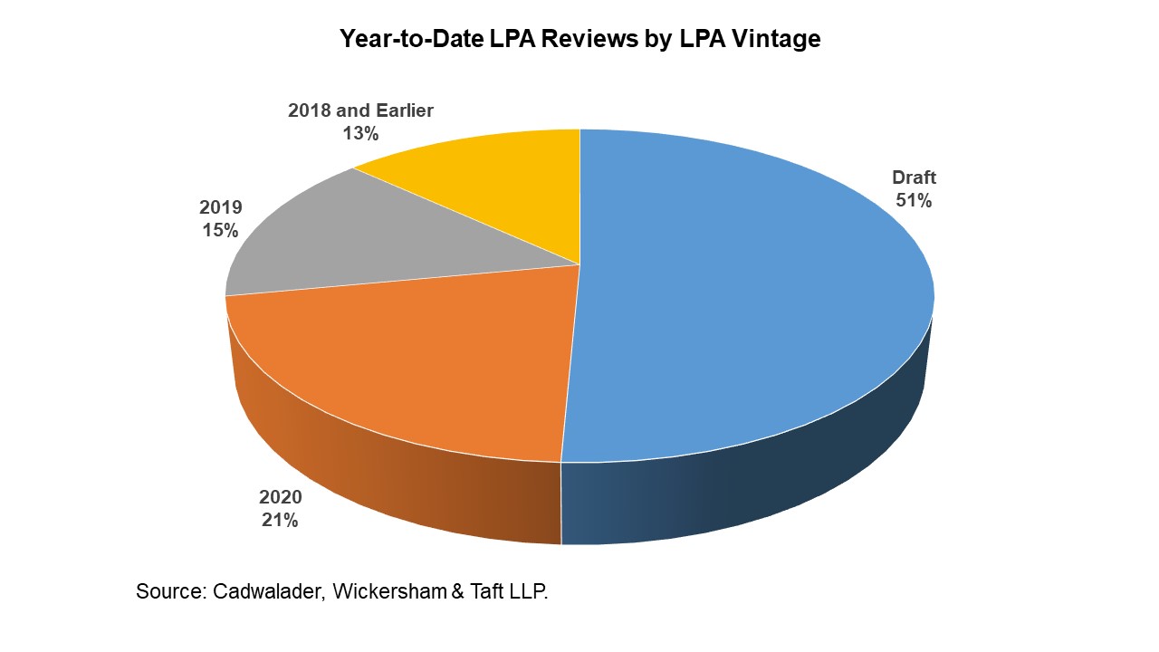 As Mike Mascia and Wes Misson reported last week, our deal volume in the first half handily exceeded the prior year. While fund formation slowed, lenders have been able to find ample opportunities. Of the LPAs we’ve reviewed year to date, nearly three-quarters were from funds closed or slated to close in 2020. The slowdown in fund formation so far hasn’t been a significant encumbrance to fund lending.