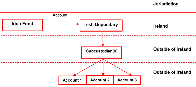 Referring to the below structure by way of illustration and example: an Irish fund would have one or more securities (and possibly also cash) accounts recorded for the benefit of the fund on the books of an Irish depositary (simplified in the illustration below as a single account).