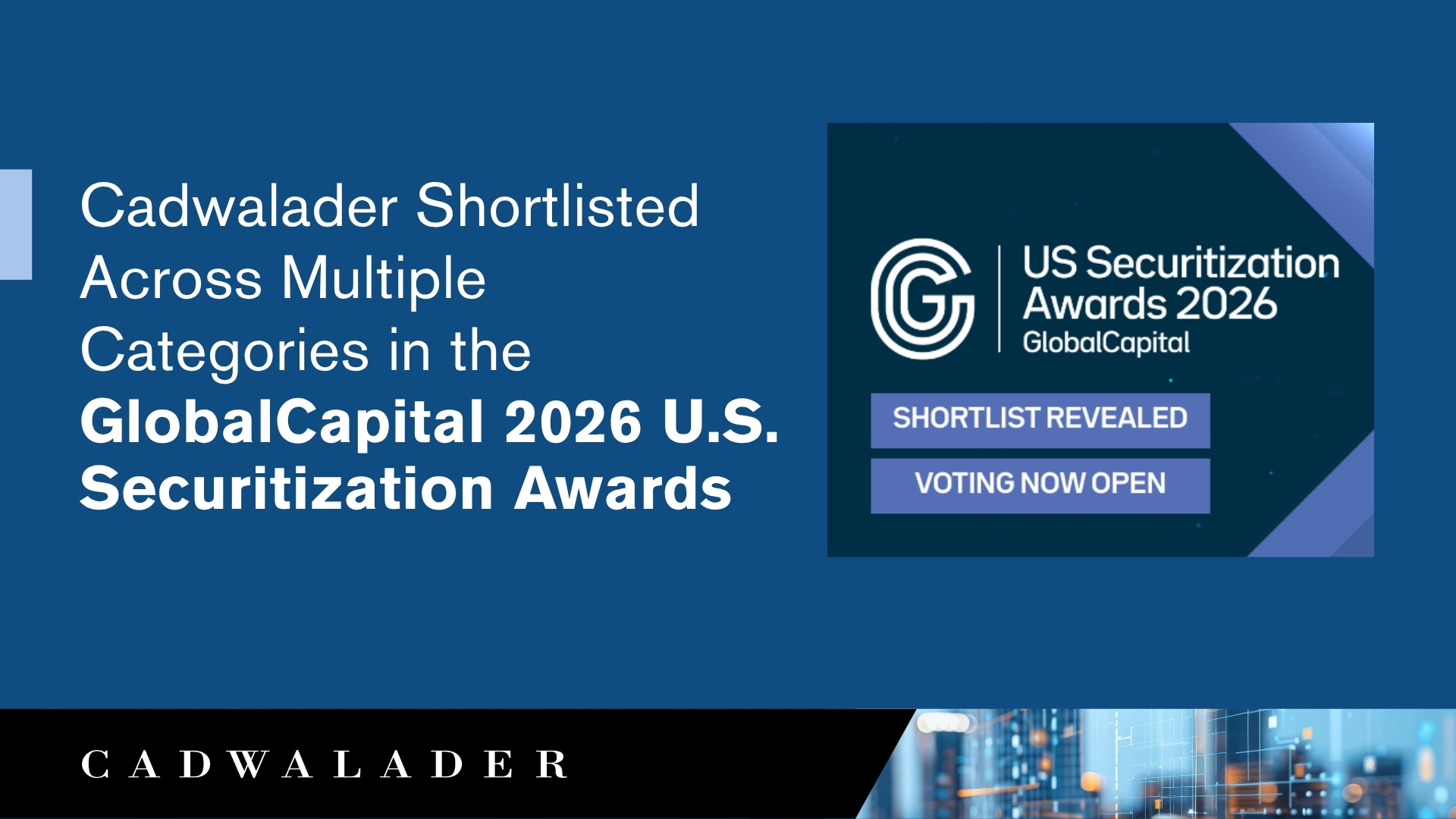 Cadwalader has been shortlisted across several categories as part of the 2026 GlobalCapital U.S. Securitization Awards, which recognize “the leading deals, institutions and market participants” in the structured finance industry.