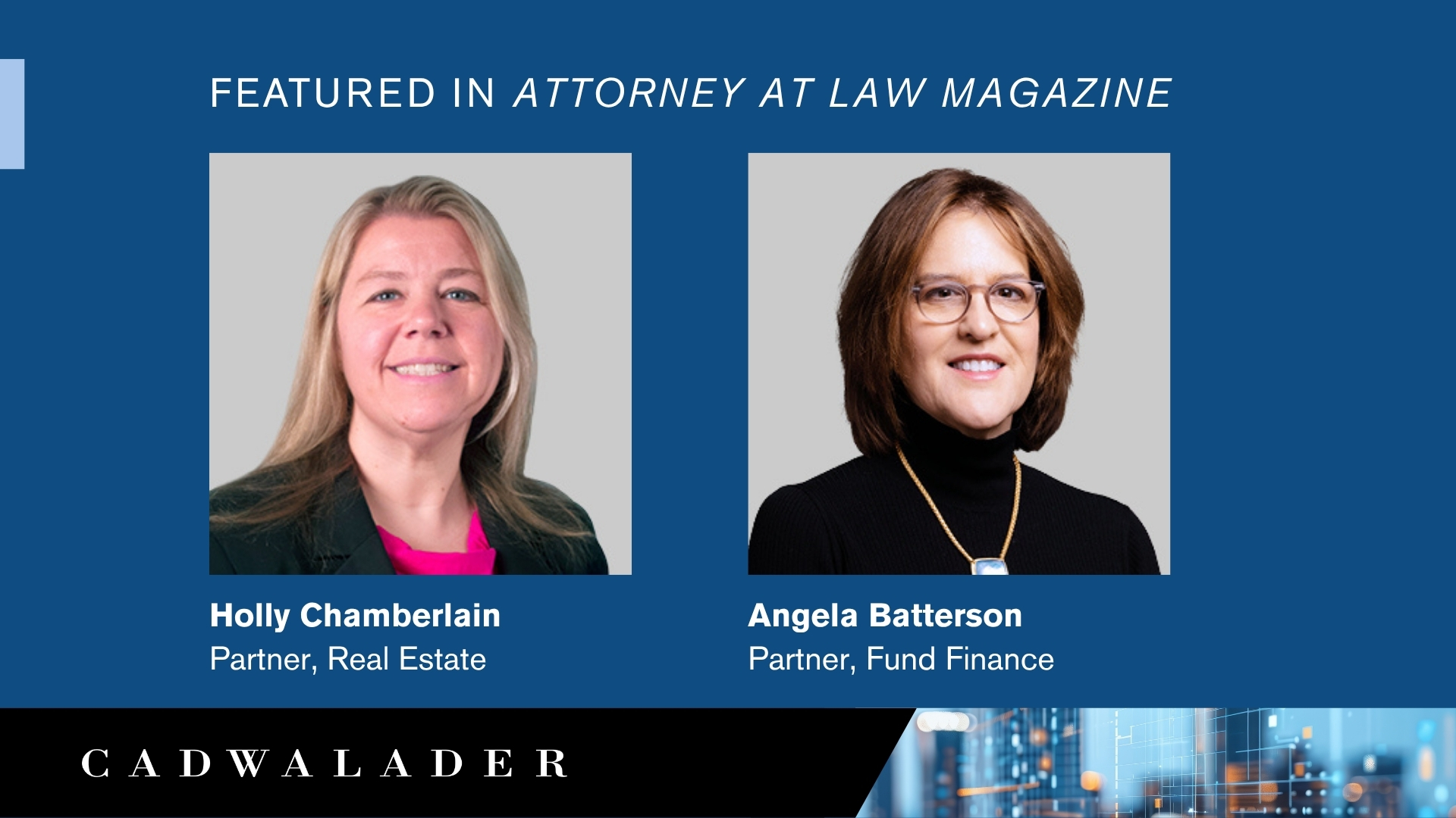 Cadwalader partners Holly Chamberlain and Angela Batterson co-authored a Women’s History Month feature for Attorney At Law Magazine, noting that “there is no single blueprint for career progression in Big Law,” and that female attorneys may very well face additional challenges. They explain that, as lawyers in traditionally male-dominated practice areas and members of Cadwalader’s Management Committee, they are “sharing a set of the behaviors and actions that have guided us and can serve as signposts for others as they look to advance in their careers.”