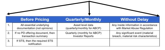 This information is to be made available before pricing[9]. The timing of the transaction documentation disclosure obligation will potentially be problematic given that documents are typically still in draft form, and often incomplete, at the time of pricing. Furthermore, Article 22(5) of the Securitisation Regulation, which relates to STS securitisations only, requires the information to be made “available before pricing at least in draft or initial form”. There does not seem to a clear basis for this apparently less onerous obligation for STS securitisations. In its Final Report, ESMA acknowledges this issue and has said that, although it falls outside ESMA’s technical mandates, it has ensured that this issue has been passed on to the responsible legislative bodies.
